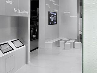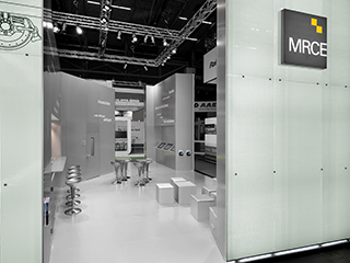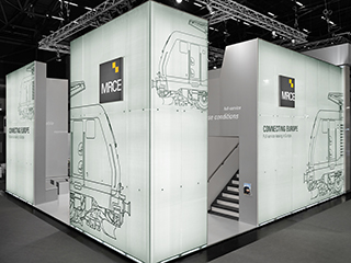 Der Stand besteht außenseitig aus ca. 5m hohen Leuchtstehlen mit linearen Grafikmotiven aus der Eisenbahnwelt. Innen sind alle wandseitigen Oberflächen, sowie die Fußböden mit einer silbernen Oberfläche beschichtet. Es ergibt sich eine edle, monochrome Erscheinung des Standes, welche den Besucher und Kunden in den Mittelpunkt stellt. Darüber hinaus hebt sich der Stand wohltuend von dem bunten Farbenmix der übrigen Messestände ab.