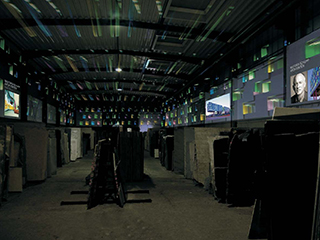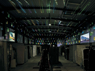 Der Besucher betritt die Veranstaltung durch das Tor der großen Lagerhalle, wo sich die Natursteinplatten aufreihen. Er wird empfangen von einer großflächigen Projektion, die alle umgebenden Flächen über eine Höhe von ca. 1,80 m bespielt. Ein prägnantes Detail aus dem Werk des zu präsentierenden Architekten überzieht die Oberflächen und bildet den atmosphärischen Hintergrund.