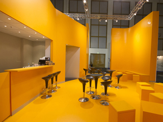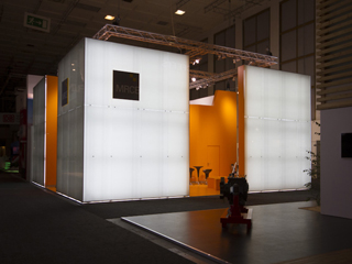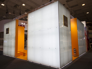 Die äußeren Hüllflächen werden von hinten mit Leuchtstoffröhren beleuchtet, so dass der Messestand von außen die Wirkung eines großen skulpturalen