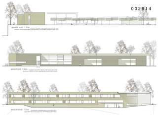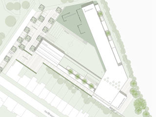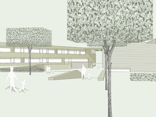 Auszug aus der Preisgerichtsbeurteilung: Die vorgeschlagene, V-förmige Gebäudestruktur beantwortet in schlüssiger und einfühlsamer Weise eine ausgesprochen schwierige städtebauliche Situation im Spannungsfeld von Blockrandbebauung und 60er Jahre Solitär. Das Ensemble von Sporthalle und Kindertagesstätte bildet das städtebauliche Rückgrat zur Wohnbebauung und schirmt sie akustisch ab. Die aufgespannte Gebäudefigur erzeugt einen dynamischen, aber dennoch gefassten Raum, der sich zum Stadtteil öffnet.