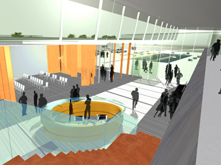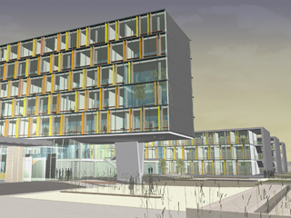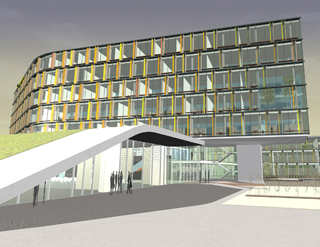 Auf einem dreieckigen Grundstück plant die Leonhard Weiss Bauunternehmung ein neues Verwaltungsgebäude. Der Entwurf sieht eine hohen Baukörper vor und drei weitere niedrigere Baukörper als Erweiterung. Die Schotten zwischen den einzelnen Fensterelementen repräsentieren Farben des Leonhard-Weiss CI. Dadurch erscheint die Fassade bei vertikaler Betrachtung maximal transparent, und verdichtet sich bei einem flachen Betrachtungswinkel, so dass eine große, in gelbtönen eingefärbte Fassadenfläche entsteht.